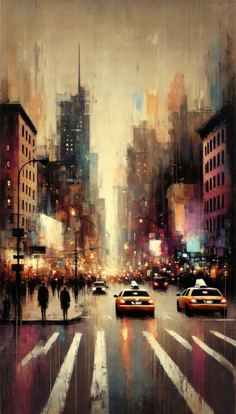 Capture the essence of New York City as twilight descends in this evocative abstract painting. Warm, muted tones blend with the silhouette of the cityscape, creating a dreamlike atmosphere that beckons viewers into a world tinged with nostalgia and mystery. Streaks of light reflect off wet streets, illuminating pedestrians and the iconic yellow taxis that find their path through the urban canyon. This piece offers a contemporary interpretation of an ever-busy, ever-mysterious city, ideal for bringing the soul of New York into any living space or collection.