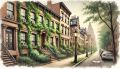 Tranquil Watercolor Streetscape of Historic Greenwich Village Brownstones