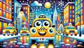 Vibrant New York City Winter Evening with Cheerful Taxi Characters