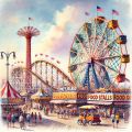 Vibrant Summer Day at Coney Island with Amusement Rides and Food Stalls