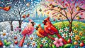 Northern Cardinals Among Blossoms and Snowflakes in New York