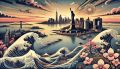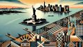 Dawn Over New York Harbor: A Stylized Panorama with Iconic Landmarks