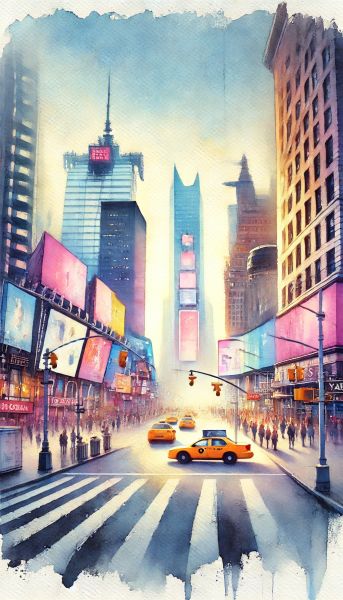 Capturing the iconic landscape of Times Square, this watercolor painting infuses familiar city scenes with a dreamlike quality. Vivid hues blend with soft brush strokes to portray the bustling street filled with glowing billboards and the ever-present yellow cabs. As throngs of people cross the streets, each brush stroke adds a layer of vibrancy and movement, reflecting the ceaseless energy of New York City. This artwork freezes a modern urban moment in time, transforming it into a magical, almost timeless piece.