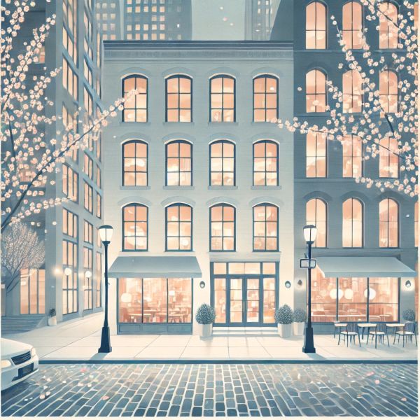 Experience a serene spring night in New York's famed Meatpacking District through this artful depiction. Soft hues bathe historic cobblestone streets, as glowing city lights reflect off the wet ground, creating a mystical ambiance. Blooming white blossoms add a touch of nature’s elegance, contrasting the industrial grace of the classic architecture. This image invites viewers to feel the peaceful yet vibrant atmosphere of a district that is both timeless and dynamic.