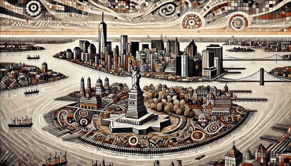 Dive into a swirling vortex of geometric forms and espresso hues, capturing New York Harbor in an arresting cubist style. This imaginative artwork presents a detailed aerial perspective that distills the essence of famous landmarks like the Statue of Liberty, Ellis Island, and the bustling cityscape. Swirling patterns and rhythmic textures lead the eye through an intricate dance of light and shadow, punctuated by recognizable architectural forms. This piece is not just a visual exercise; it invokes the dynamic energy and historical richness of New York City, transforming familiar scenes into a fresh visual language.