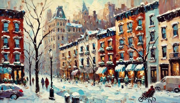 Title: Vibrant Snowfall in Greenwich Village: An Abstract Winter Perspective