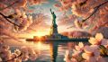 Sunrise Embrace: Statue of Liberty Amid Cherry Blossoms