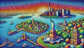 Enchanting Dawn Over New York Harbor: A Pointillist Dream