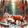 Autumnal Whisper: A Red Fox Family's Snow-Kissed Forest Journey