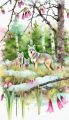 Serene Watercolor Painting of Coyote Family in Spring Forest
