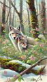 Mother Coyote and Pups Amidst Spring Bloom in Forest