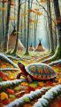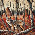 Autumn Embrace: A Coyote and Her Pup Amongst Birch and Teepees