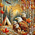 Autumn Majesty: A Cubist Forest with Eagles and Seasonal Splendor