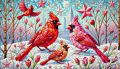 Vibrant Cardinal Family in a Cubist-Inspired New York Cityscape